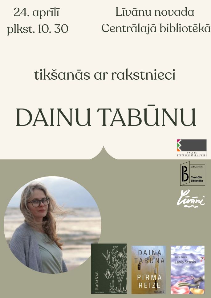 Ceturtdien, 24.aprīlī plkst. 10:30 Līvānu bibliotēka aicina uz Valsts kultūrkapitāla fonds atbalstītā projekta “Sarunas ar radošām personībām” tikšanos ar rakstnieci Dainu Tabūnu.