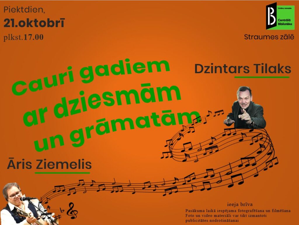 21.oktobrī plkst.17.00 Līvānu novada Centrālās bibliotēkas Straumes zālē notiks muzikāli literārs pasākums “CAURI GADIEM AR DZIESMĀM UN GRĀMATĀM”.
