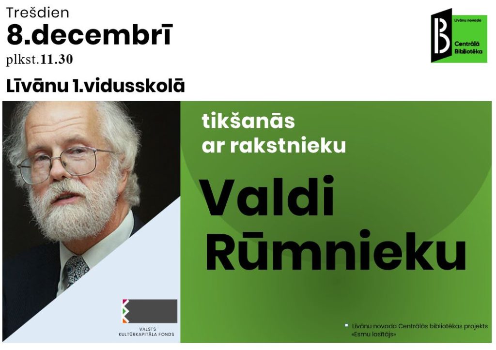Trešdien, 8. decembrī plkst.11.30 Līvānu 1. vidusskolā rakstnieks Valdis Rūmnieks tiksies ar vidusskolēniem Līvānu novada Centrālās bibliotēkas projekta “Esmu lasītājs” ietvaros, lai atklātu dzejnieka Aleksandra Čaka personības nozīmīgumu latviešu literatūrā.