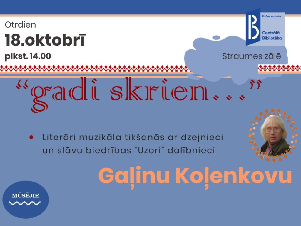18.oktobrī plkst.14.00 Līvānu novada Centrālās bibliotēkas Straumes zālē notiks muzikāli literārs pasākums “gadi skrien…”.
