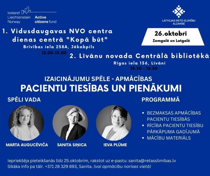 26.oktobrī, ceturtdien, plkst. 15.30 Līvānu novada Centrālajā bibliotēkā aicinām apmeklēt bezmaksas apmācības par pacientu tiesībām un pienākumiem, par rīcību pacientu tiesību pārkāpuma gadījumā!